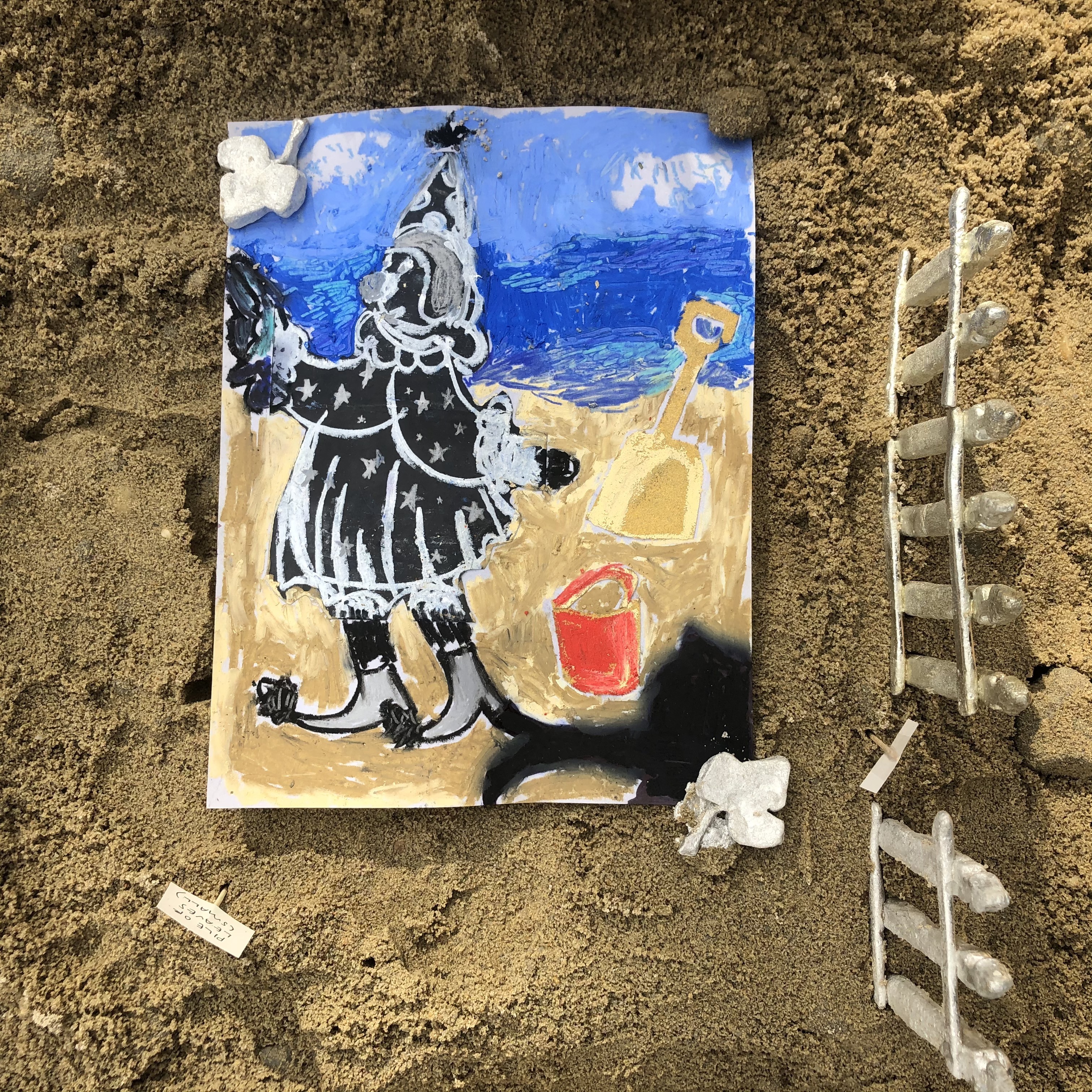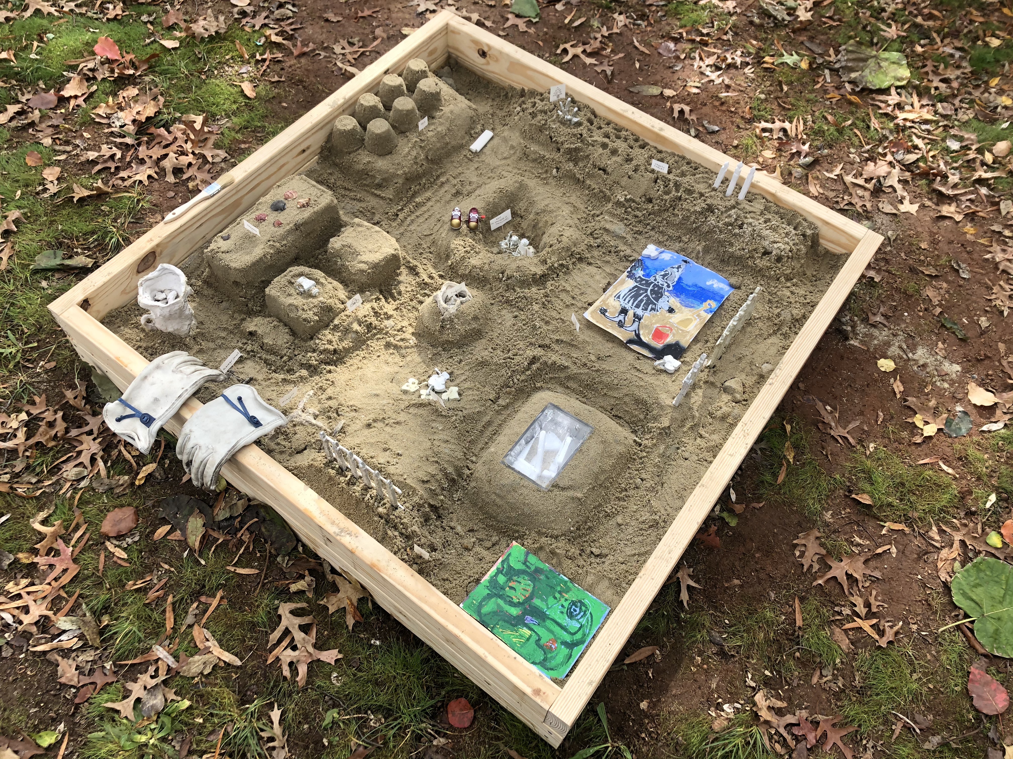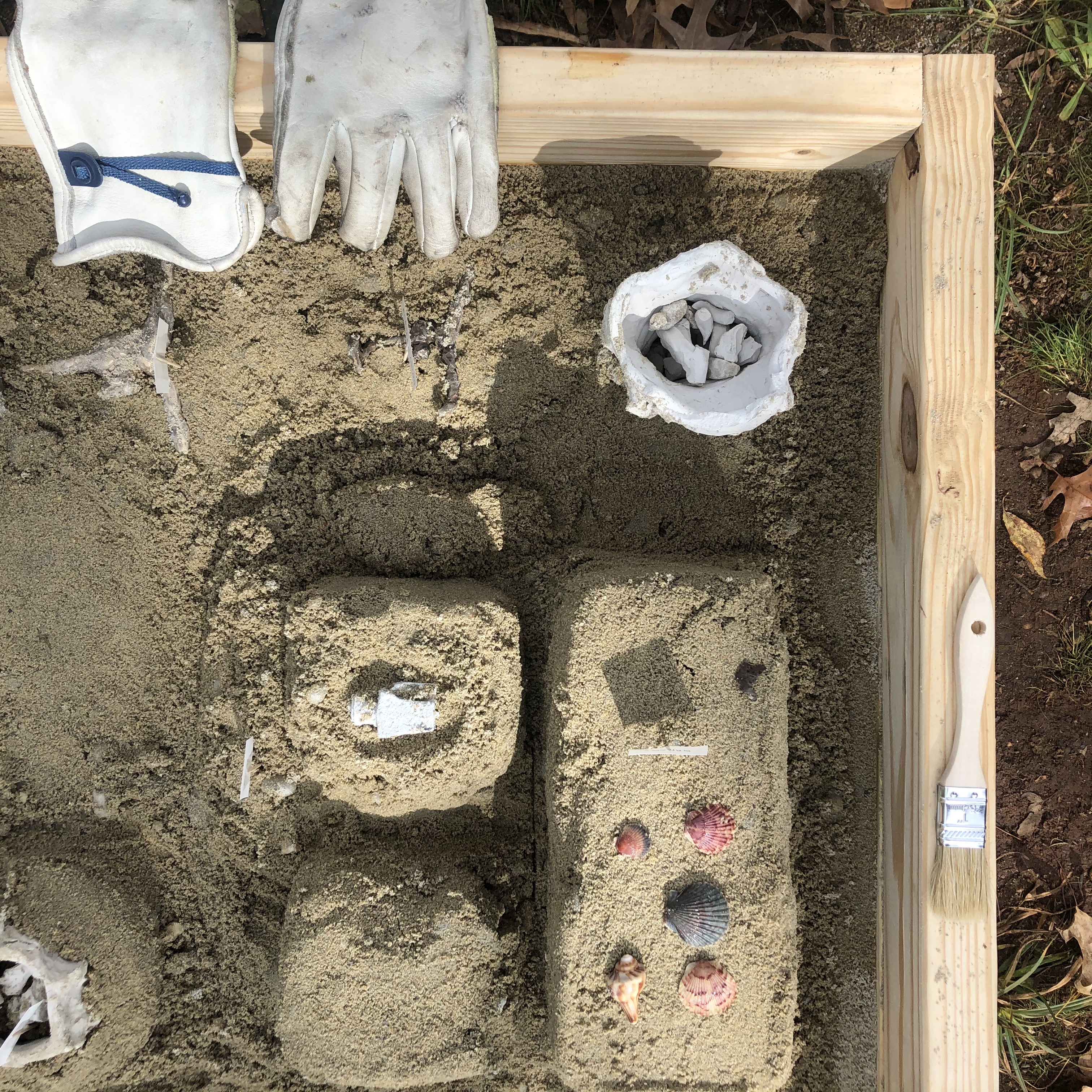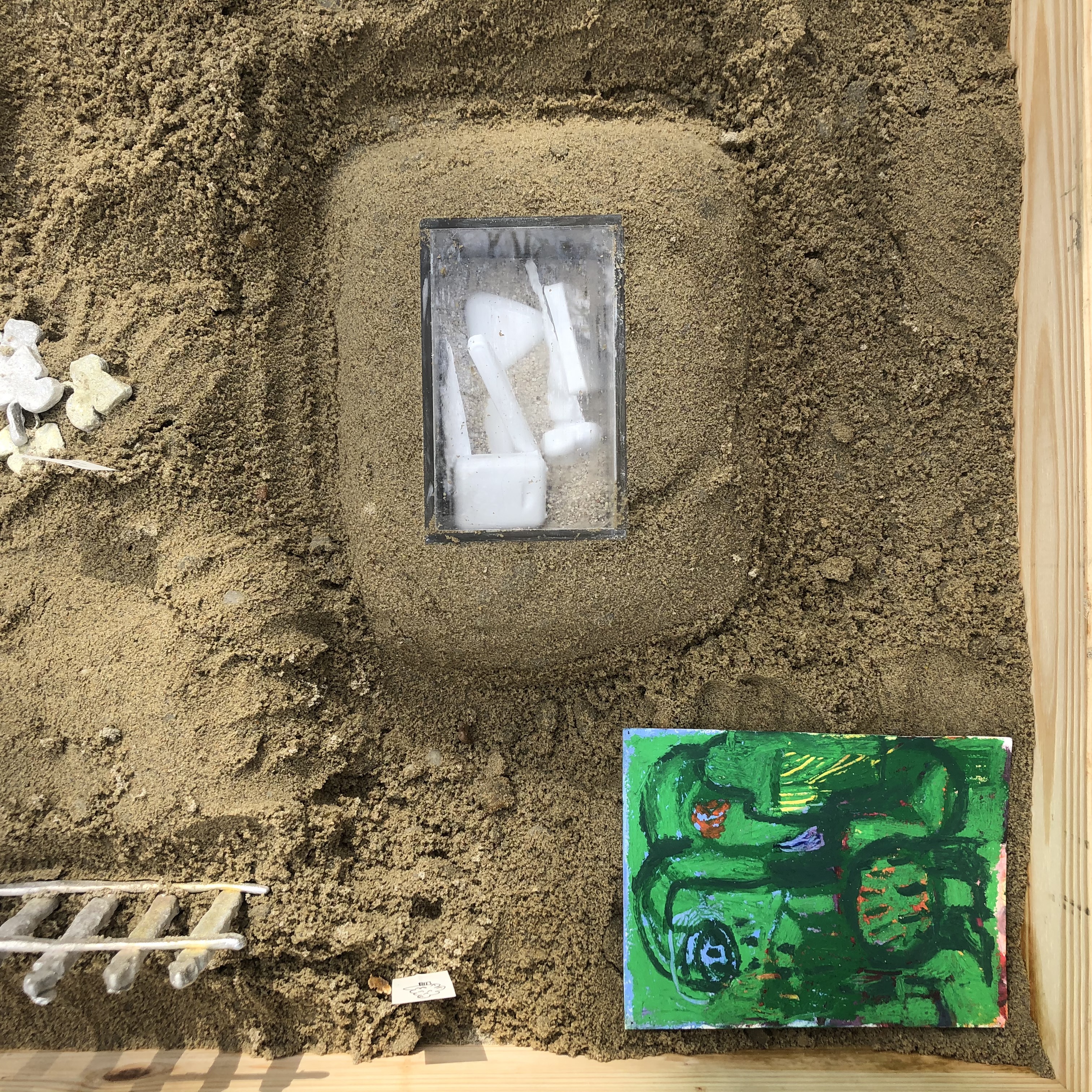 Materials list: wood, play sand, rainwater, broken clay vessel, plaster pocket