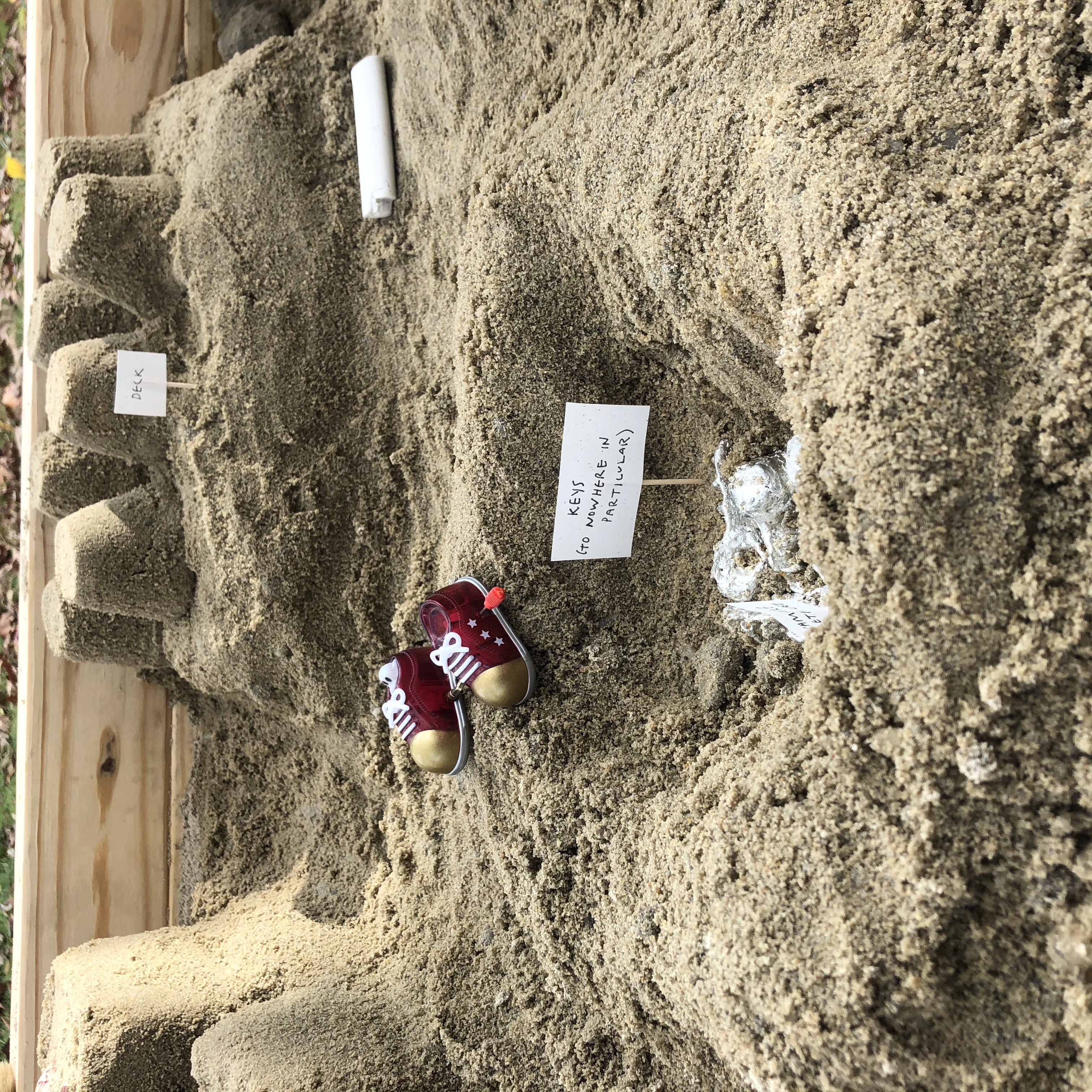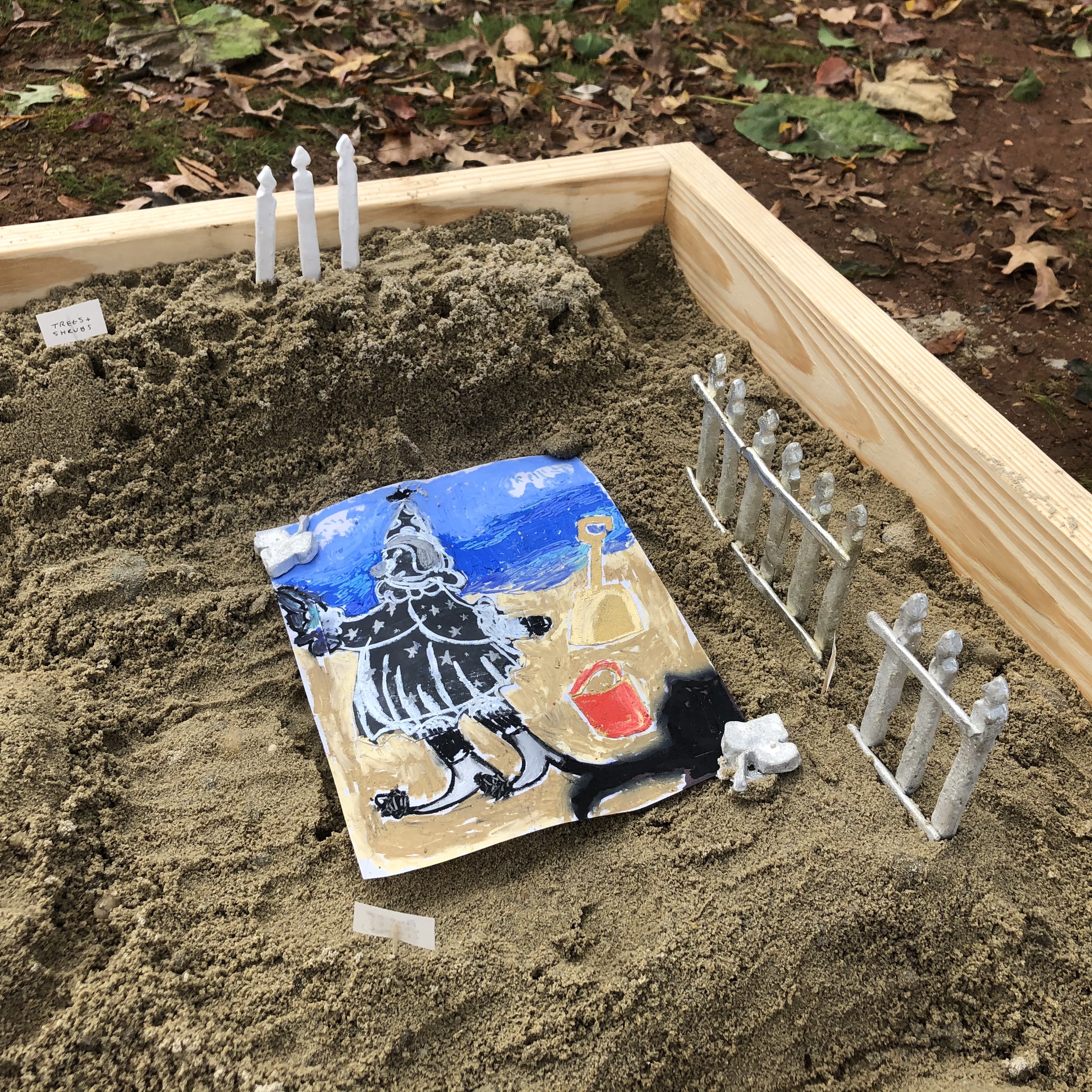 Materials list: wood, play sand, rainwater, broken clay vessel, plaster pocket